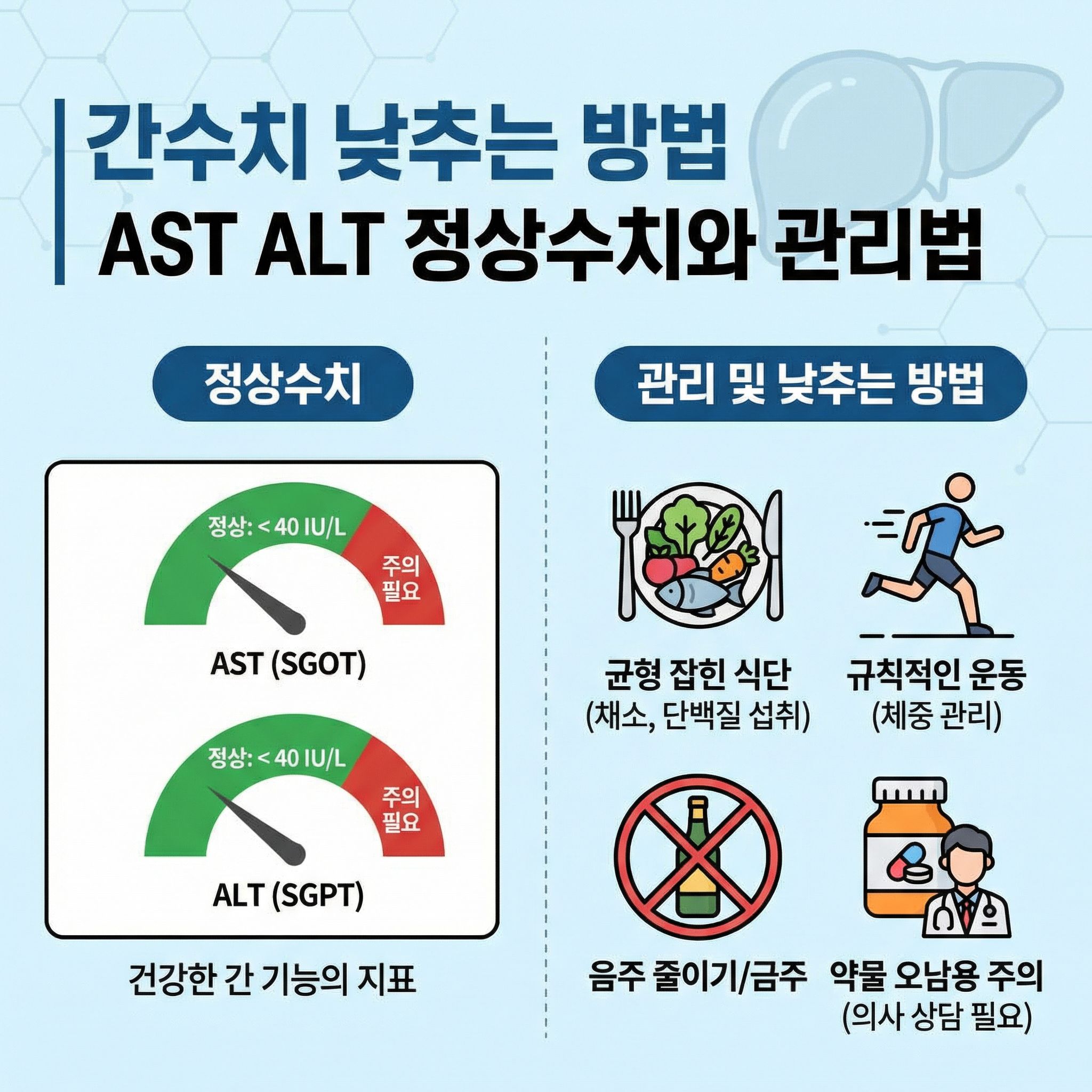 실제 사례: 30대인 제 동생은 ALT가 90이었지만 3개월간 금주, 식단 조절, 운동을 병행한 결과 ALT가 28로 정상 수치로 돌아왔습니다.