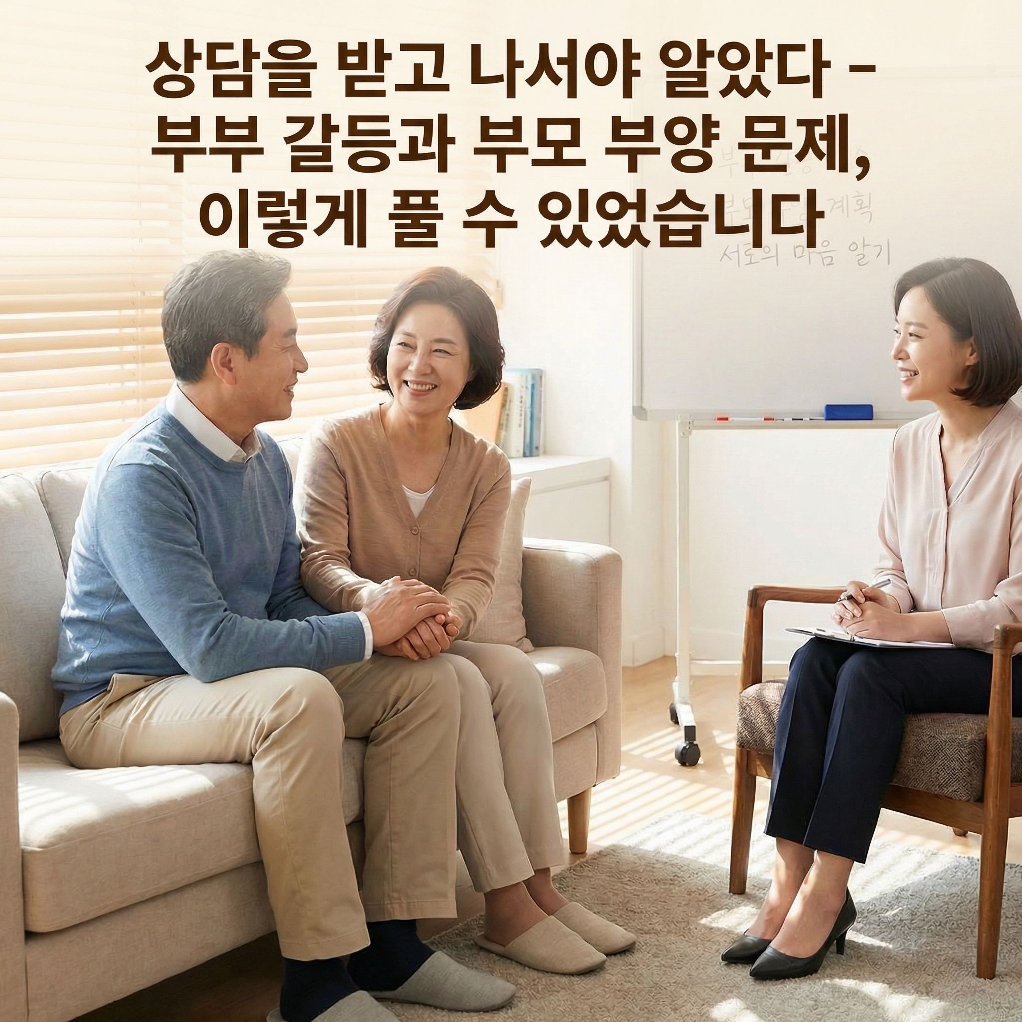 | 저도 한때 부모 부양 문제로 남편과 반복적으로 다투다가 결국 가족상담사를 찾아갔습니다. 그곳에서 처음으로 "아, 이게 이런 구조였구나" 하는 걸 깨달았어요. 부부 갈등과 부모 부양 문제는 어떻게 생기는지, 상담에서 배운 구체적인 해결 방법과 실제 사례를 최대한 솔직하게 공유합니다. 비슷한 상황에 계신 분들께 실질적인 도움이 됐으면 합니다. |