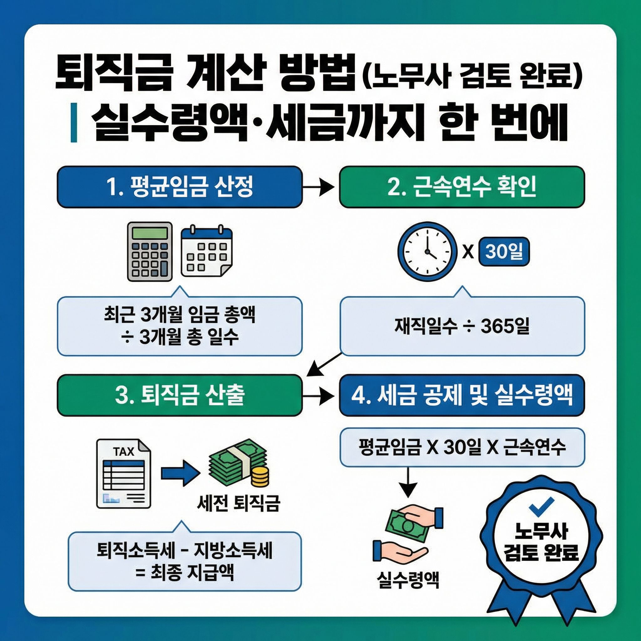 퇴직금 계산 공식부터 평균임금 산정, 세금 공제, 퇴직금 못 받았을 때 대처법까지 노무사 상담 경험을 바탕으로 정리했습니다. 2025년 근로기준법 기준 | 노무사 검토