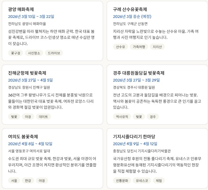 | 2026 전주·제주 봄·여름 축제 일정 총정리|국내 여행 추천 축제 가이드 (1) | 2026.03.16 |