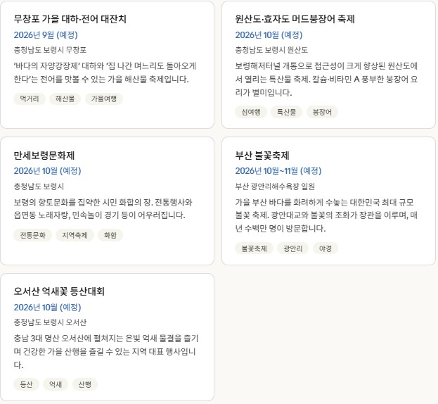 한국 관광공사 대한민국 구석구석, 문화체육관광부 지역축제, 보령시 공식 홈페이지, 부산축제조직위원회, 진해군항제 공식채널, 각 지자체 발표자료(2026년 4월 기준)