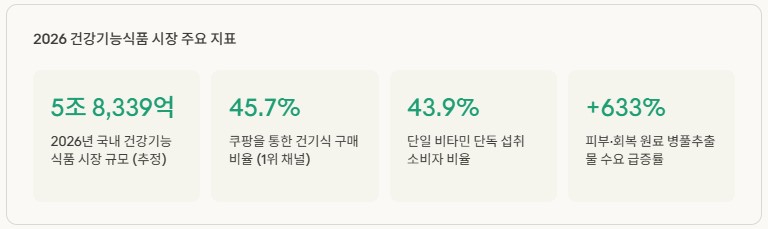 글로벌 시장조사기관 민텔(Mintel)은 2026년 건강식품 시장의 중심축이 '근육 강화'에서 '회복·두뇌·피부 관리'로 이동했다고 분석했습니다. 운동 후 근육 회복을 돕는 성분, 집중력과 기억력을 지원하는 뇌 건강 성분, 콜라겐 등 피부 관리 성분이 동반 성장하고 있습니다.