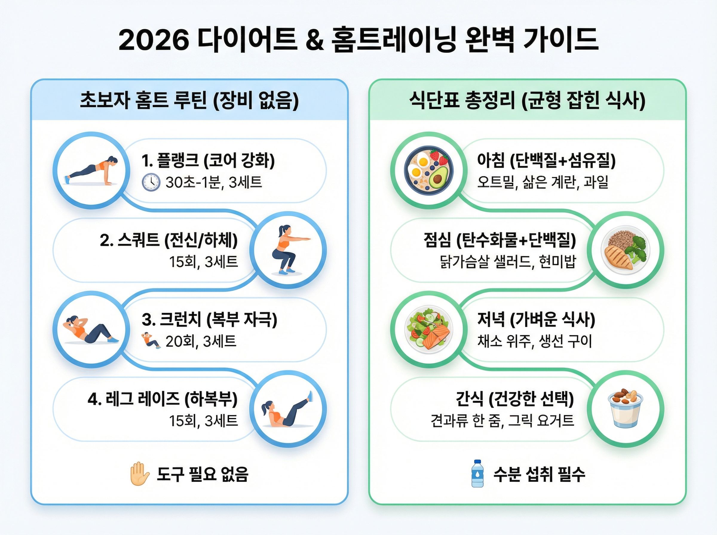 헬스장 없이도 됩니다. 퍼스널 트레이너 상담 후 직접 3개월 실천한 홈트레이닝 루틴과 다이어트 식단을 공개합니다. 초보자도 바로 따라 할 수 있도록 주차별로 단계적으로 정리했습니다.