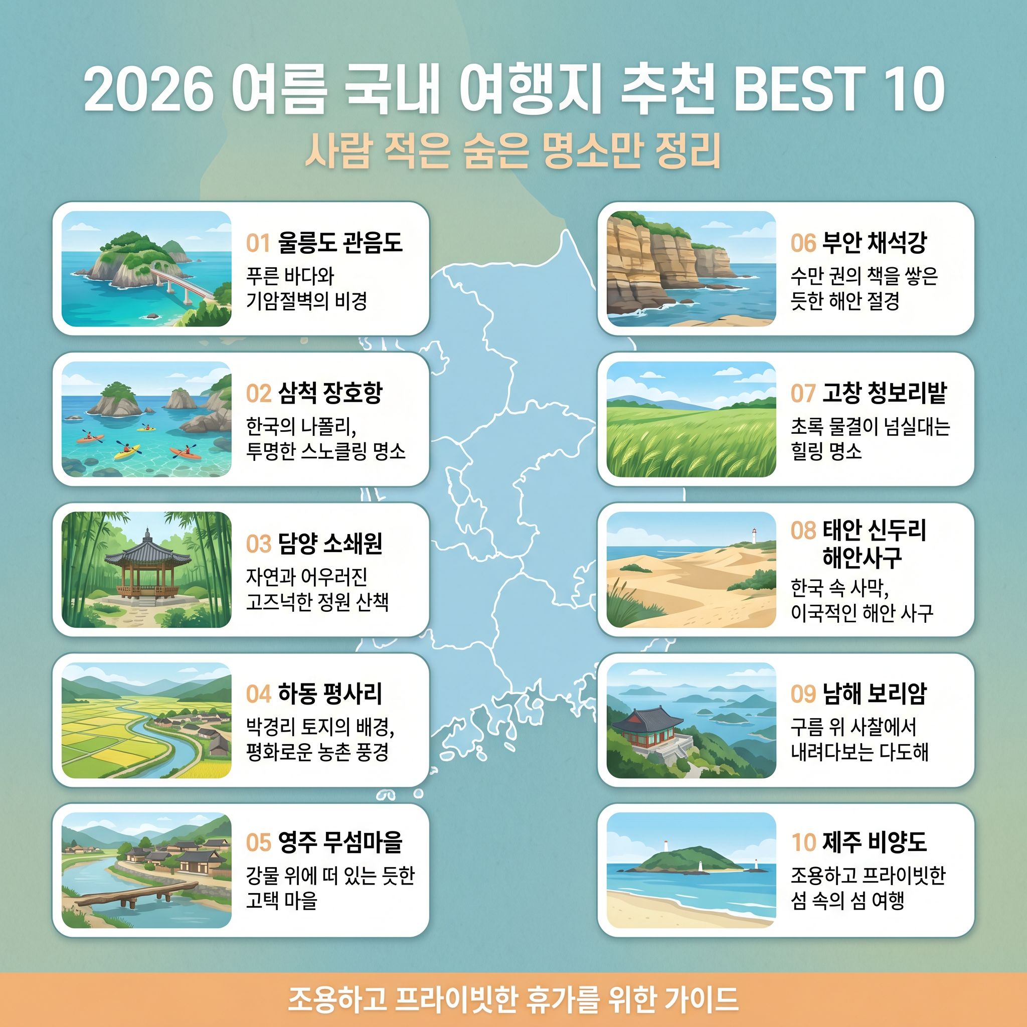 2026년 여름, 북적이는 인기 관광지 대신 나만 아는 국내 숨은 여행지를 찾아 진짜 힐링을 경험해 보세요. 위에 소개한 10곳은 모두 자연이 살아있고, 사람이 적어 여유롭게 즐길 수 있는 검증된 명소들입니다.