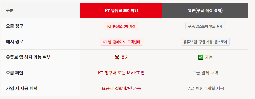 아래 표를 통해 KT 유튜브 프리미엄과 일반(구글 직접 결제) 유튜브 프리미엄의 주요 차이점을 명확하게 파악하시기 바랍니다.